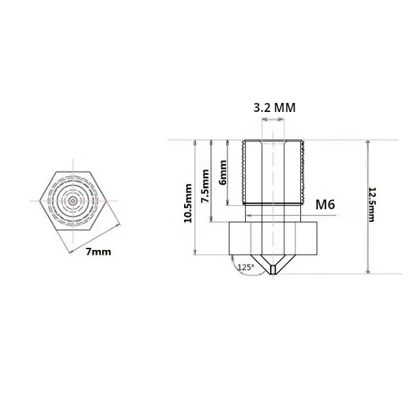 Buse d’extrusion en laiton compatible avec les têtes d’impression J-head E3D (V4, V5, V6, Kraken). Convient aux extrudeurs équipés de buses avec filetage M6 et supportant des filaments de diamètre 3 mm.