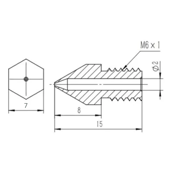 Buse d’extrusion en acier, conçue pour les têtes d’impression 3D. Compatible avec les extrudeurs dotés d’un filetage M6 et utilisant des filaments de 1.75 mm de diamètre.